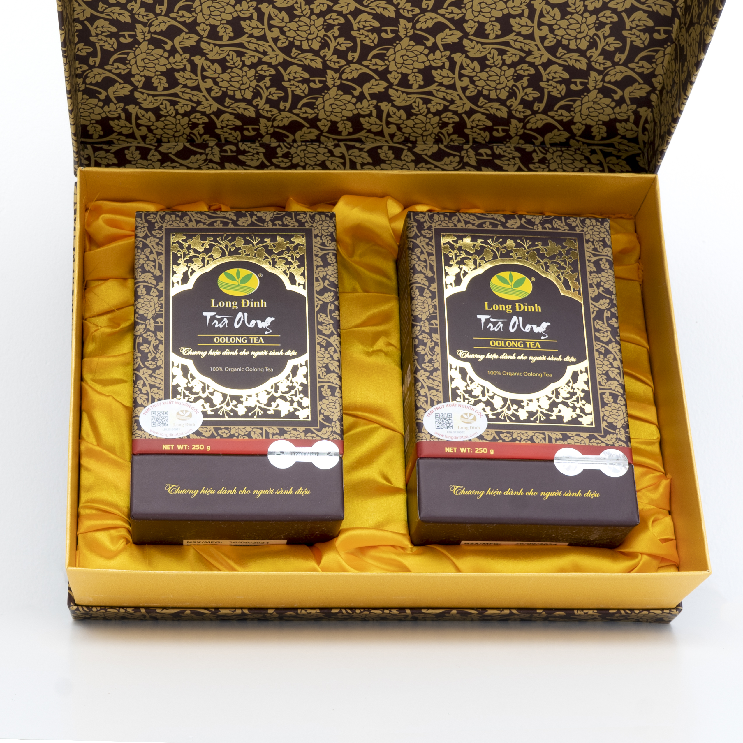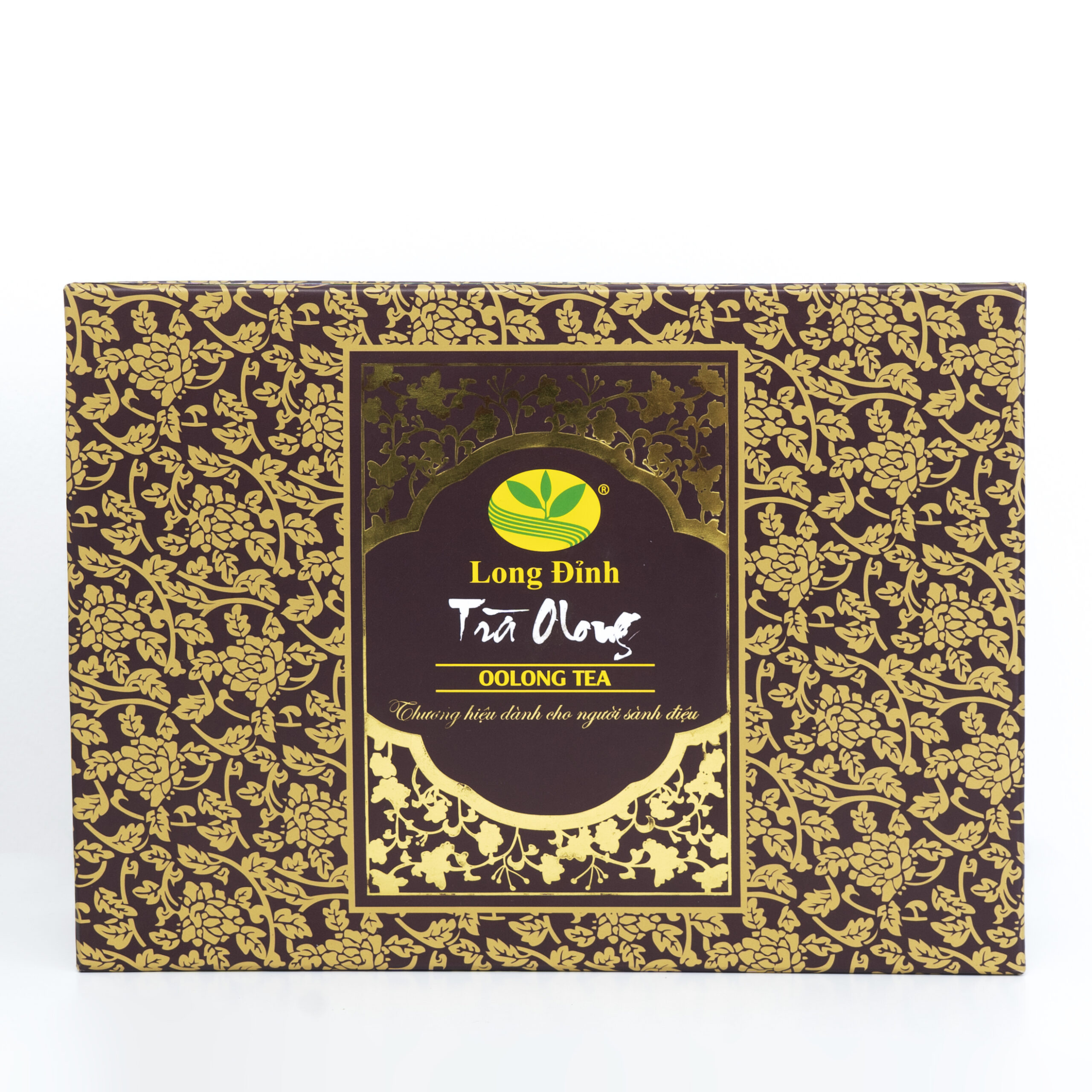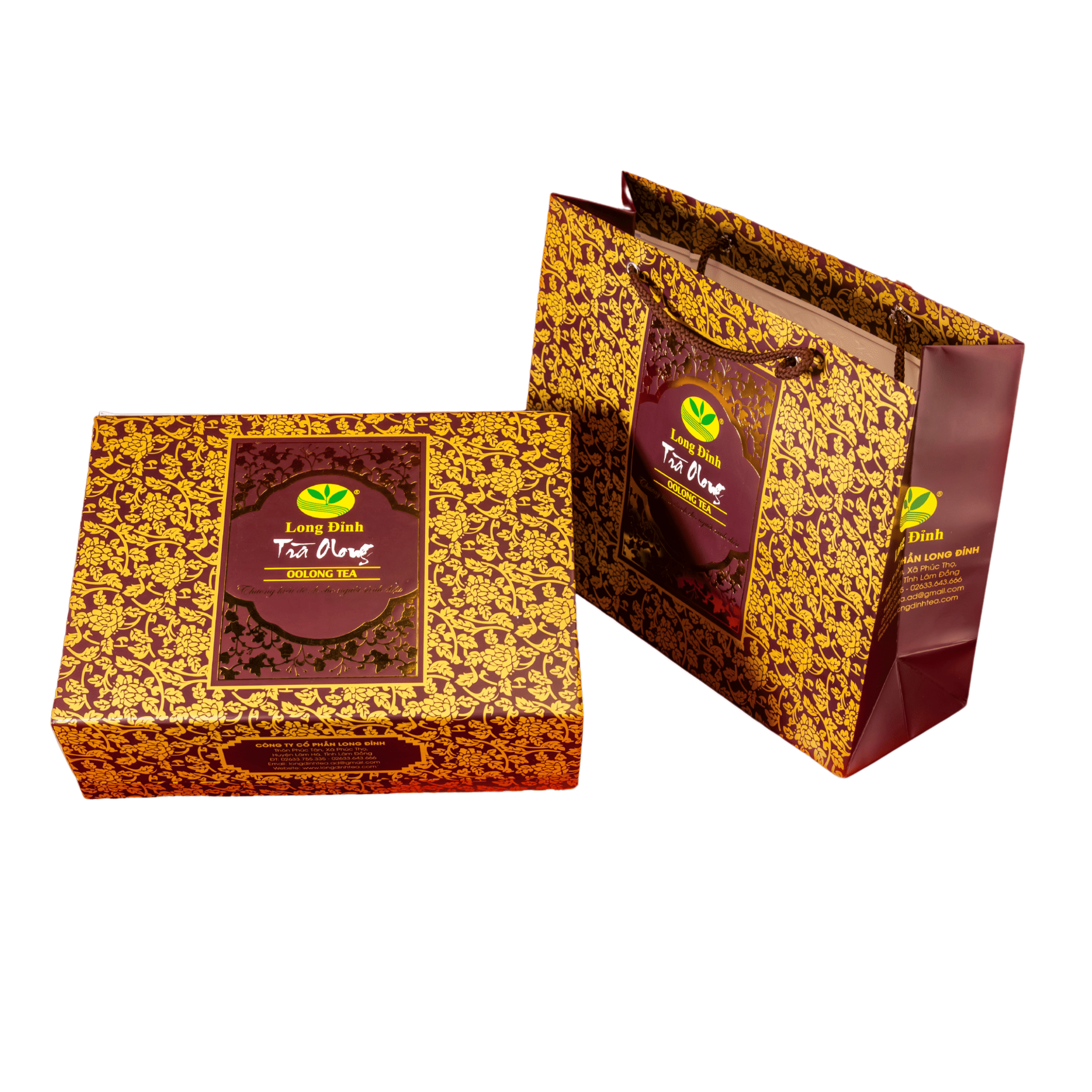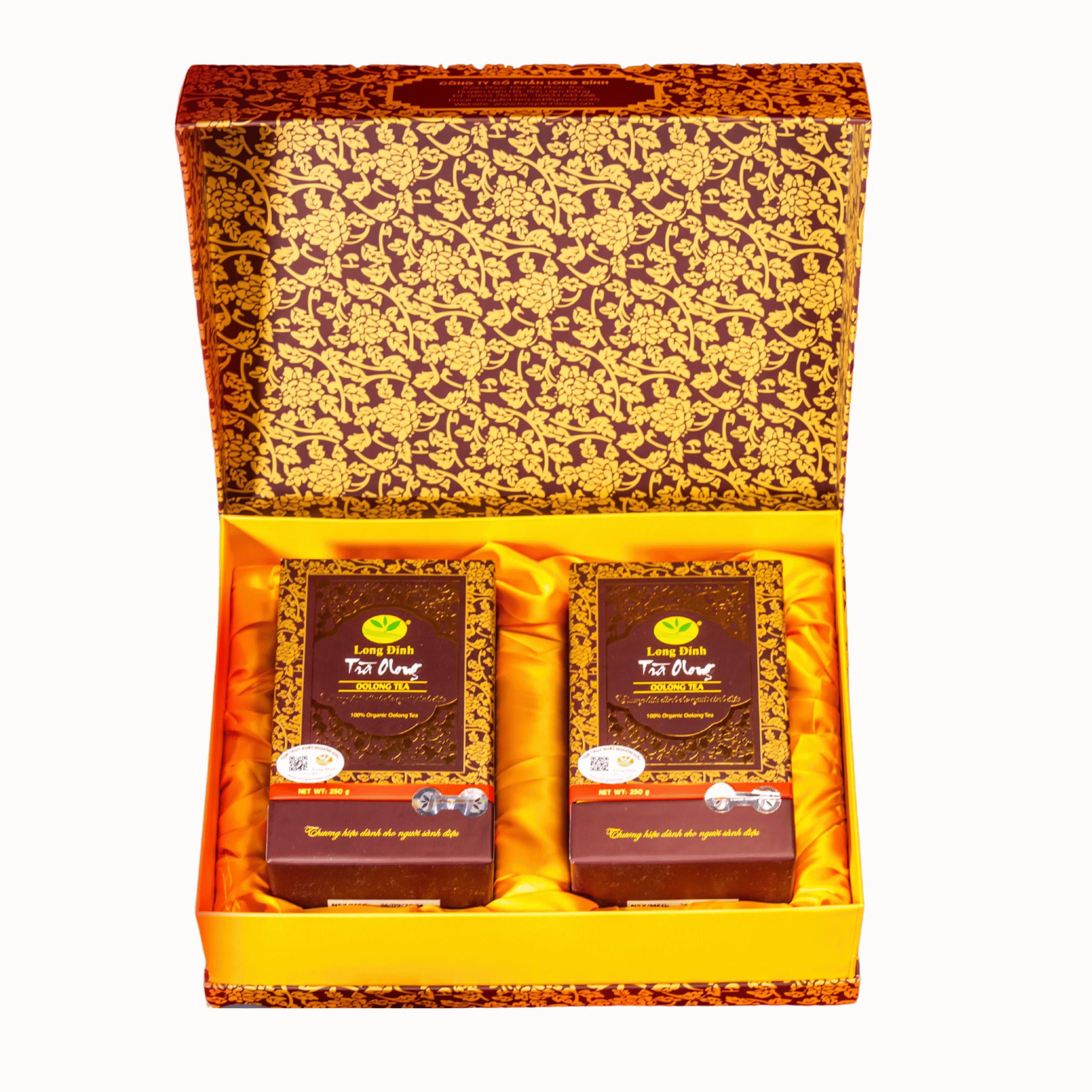 Trong mỗi bộ quà tặng trà olong lễ nâu chứa 2 hộp trà olong thuần được đóng gói trong bao bạc và chứa trong hộp giấy đồng họa tiết với bao bì và được in họa tiết nổi nên khi chạm tay vào hộp giấy cho cảm giác tay mềm mại và tinh tế.